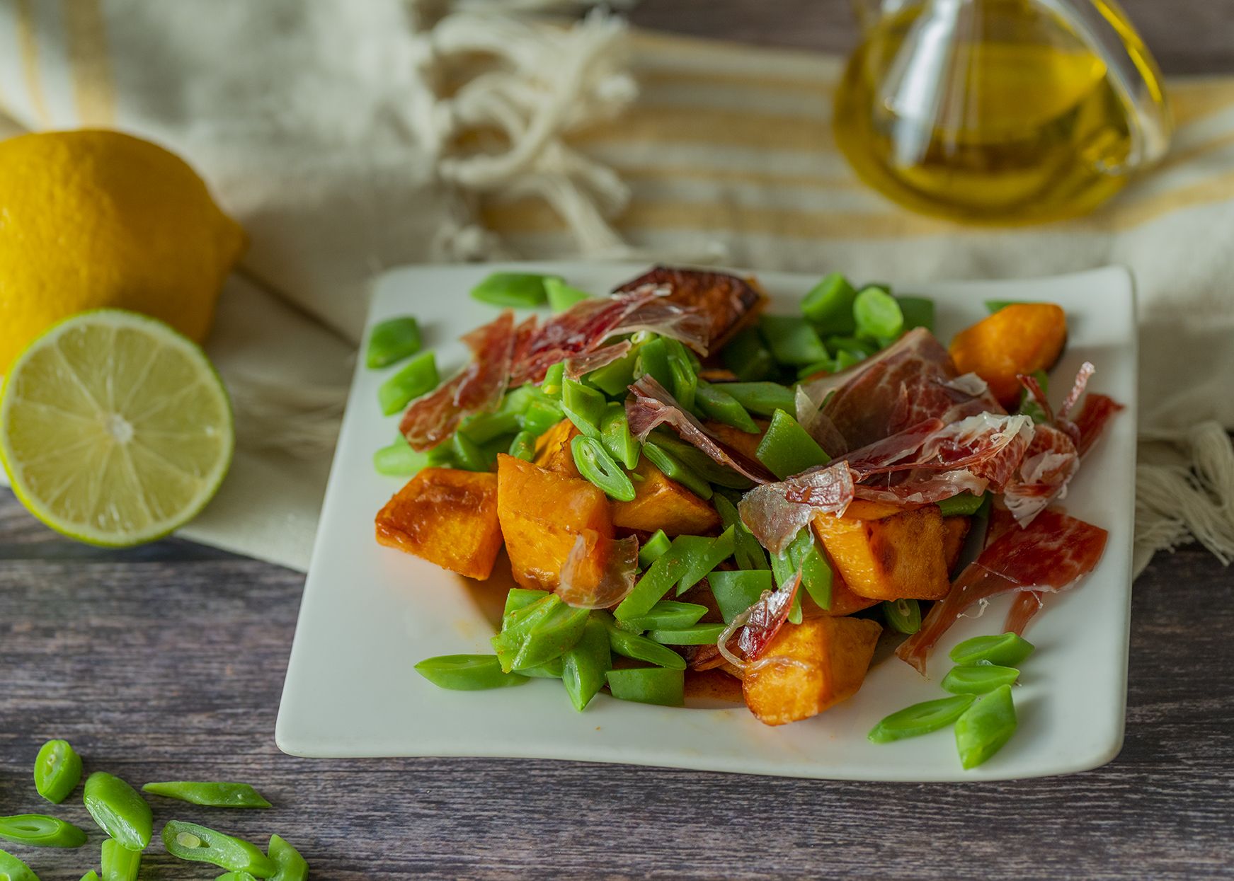 Ten a mano todos tus ingredientes: Judías verdes, boniato, jamón ibérico, aceite oliva, pimentón, lima y limón.