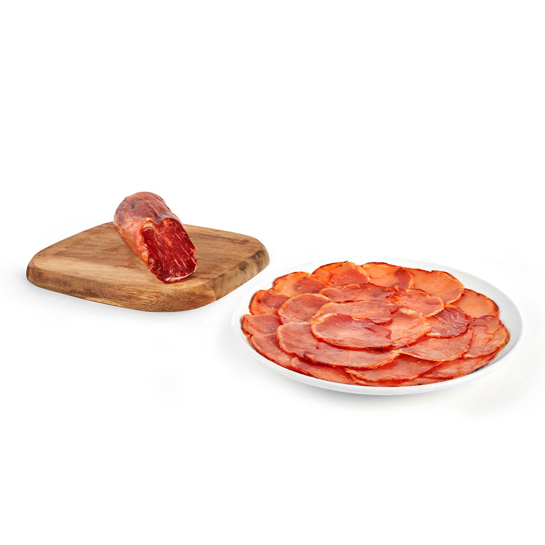 Nuestro lomo ibérico proviene de los mejores cerdos ibéricos, producido a partir de una de las piezas más nobles de este animal, ubicada en la parte dorsal, una zona que combina la ausencia prácticamente total de grasa externa con el veteado interior propio de la raza ibérica.