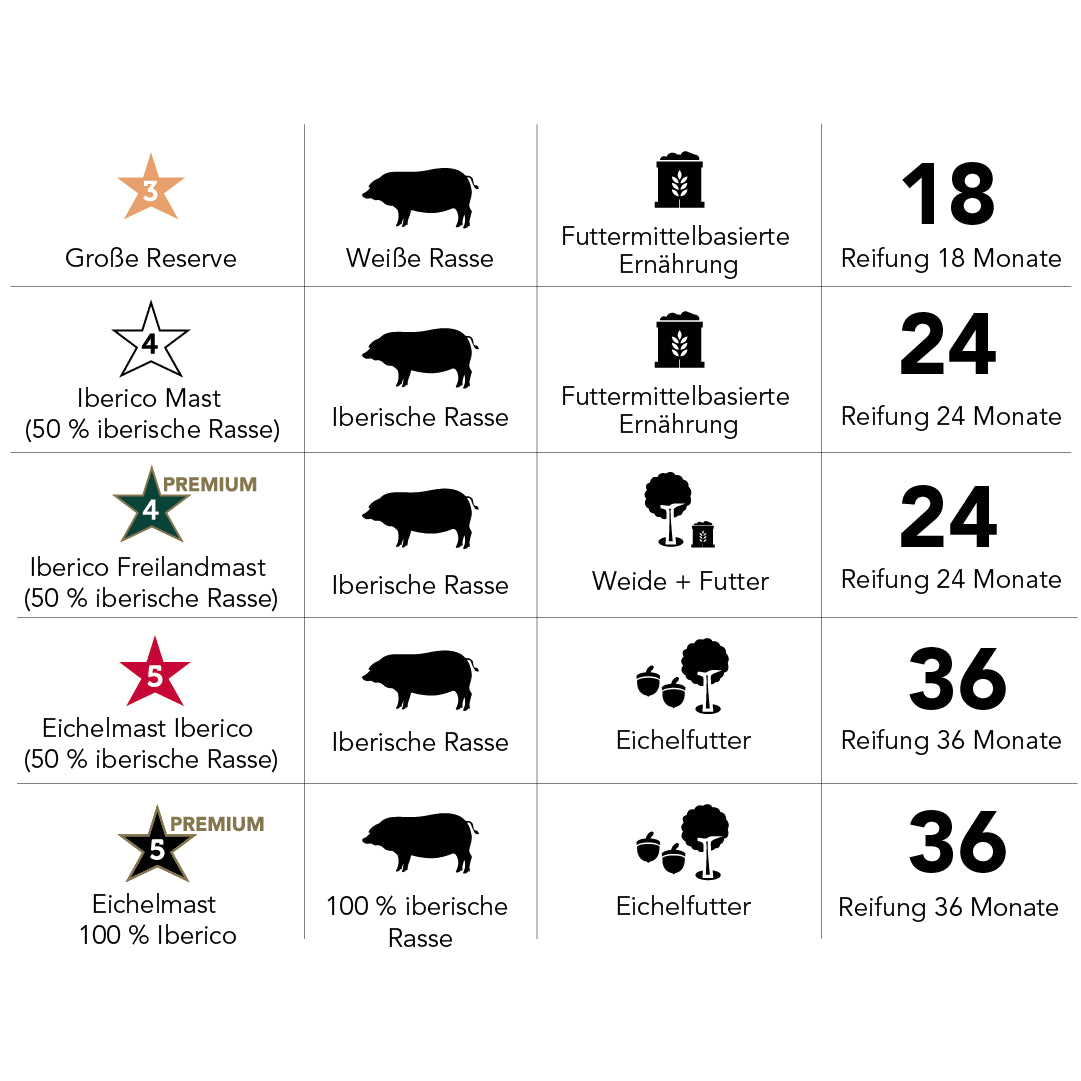 Die iberische Rasse, die aufgrund ihrer genetischen Eigenschaften und ihrer Aufzucht auf der iberischen Halbinsel einzigartig in der Welt ist. In Bezug auf die Fütterung kann der iberische Schinken der iberischen Rasse als "de cebo ibérico", "de cebo ibérico" oder "cebo de campo ibérico" oder "bellota ibérico" bezeichnet werden, je nachdem, ob er auf dem Bauernhof allein gelassen wurde und Futter und Getreide gefressen hat, oder ob er frei in der Natur war oder die Montanera gemacht hat und sich daher von Wildkräutern, Eicheln und beim Grasen auf der Weide ernährt hat, bis er das richtige Gewicht erreicht hat.