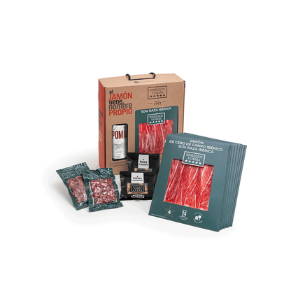 And what do you save with this pack? Well, you'll get wine and Sevillian breadsticks as a gift. The 980 grams of Jamón cebo de campo 50% Iberian breed come in a convenient and practical box that includes: