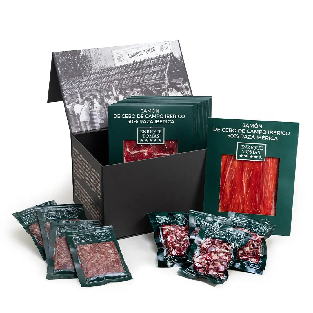 Cutting ham is an art, but if you do not master the technique, follow our advice and enjoy the best Iberian ham in the world with the Enrique Tomas no te cortes packs. Envelopes of sliced ham and shoulder ham, cubes and shavings for tapas and, of course, the chopped bones of the ham that we have prepared for you, so that you can make spectacular soups and stews.