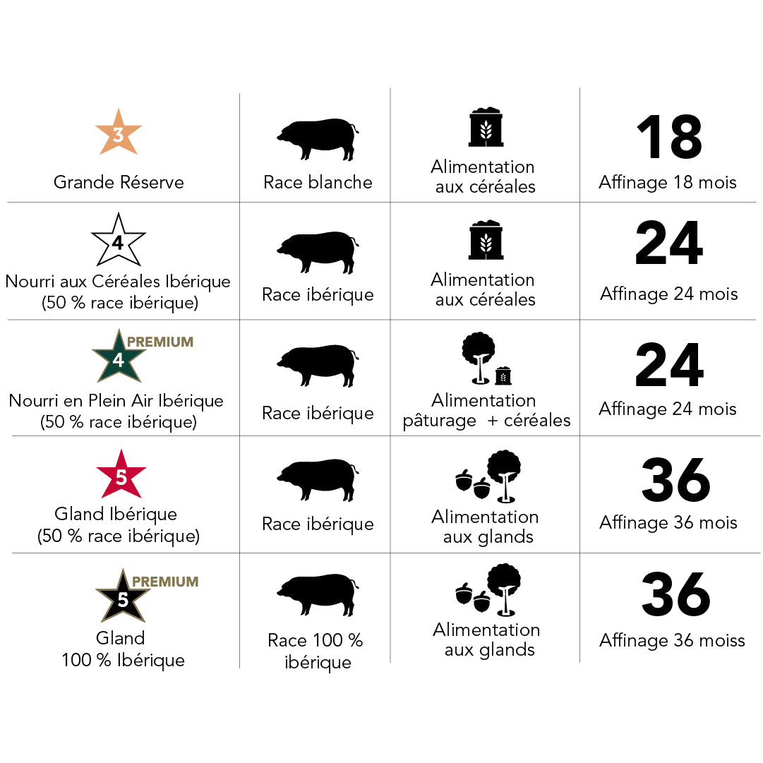 La race ibérique, unique au monde pour ses qualités génétiques et son élevage dans la péninsule ibérique. En termes d'alimentation, le jambon ibérique, de race ibérique, peut être appelé "de cebo ibérico", "de cebo ibérico" ou "cebo de campo ibérico" ou "bellota ibérico", selon qu'il a été laissé seul à la ferme et a mangé du fourrage et des céréales, ou qu'il a été en liberté à la campagne ou a fait la Montanera et s'est donc nourri d'herbes sauvages, de glands et en broutant dans les pâturages jusqu'à ce qu'il ait atteint le bon poids.