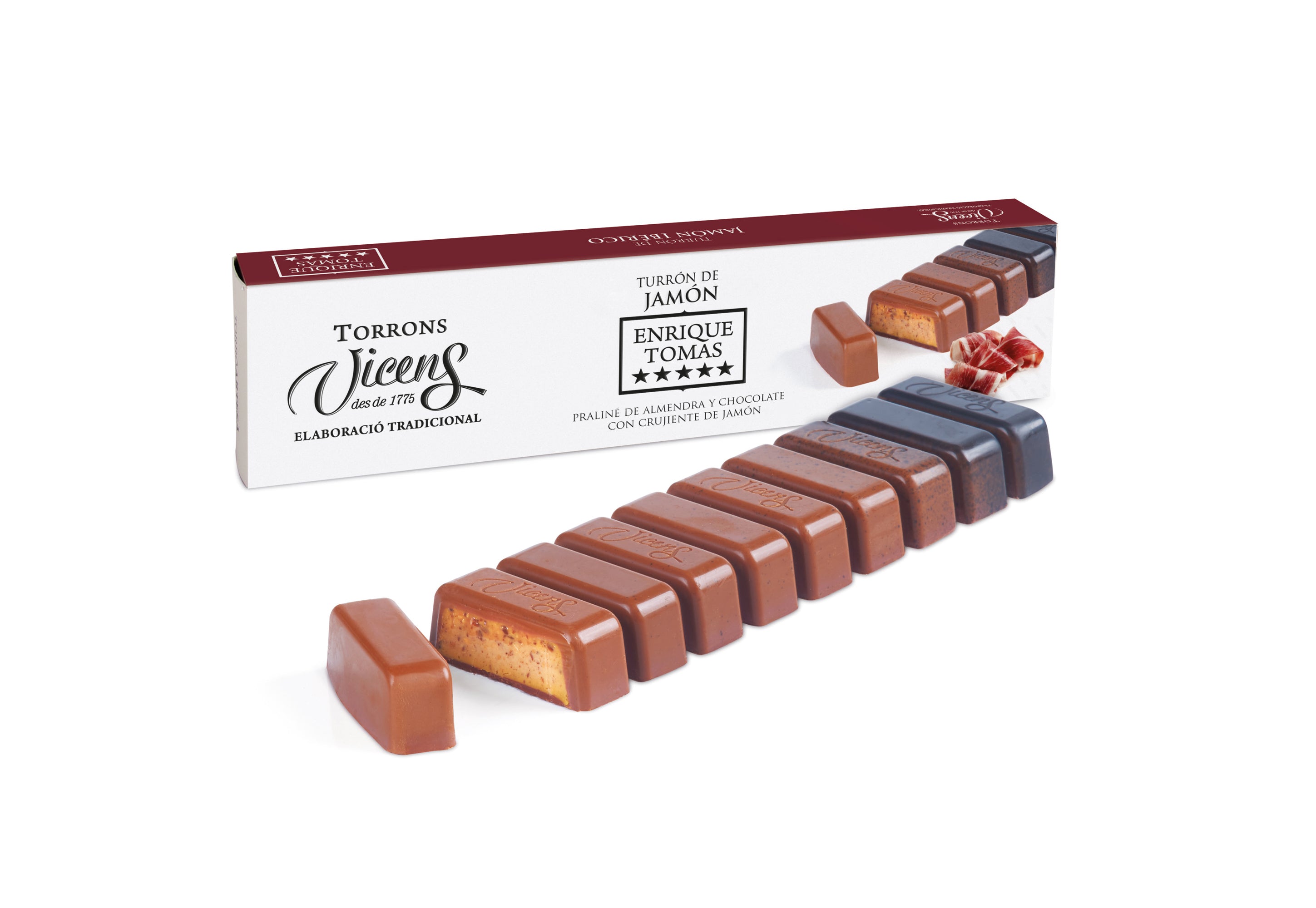 L’union entre Enrique Tomás et Turrons Vicens n’est pas qu’une simple collaboration, mais une véritable déclaration d’intention : élever la gastronomie à un nouveau niveau. De cette alliance naît le turrón de jamón, une combinaison insolite qui marie l’intensité du meilleur jamon ibérique avec la texture et la douceur du turrón traditionnel. Bien plus qu’une simple gourmandise, c’est une expérience gastronomique unique – une bouchée inédite qui réinvente la tradition et surprend le palais.