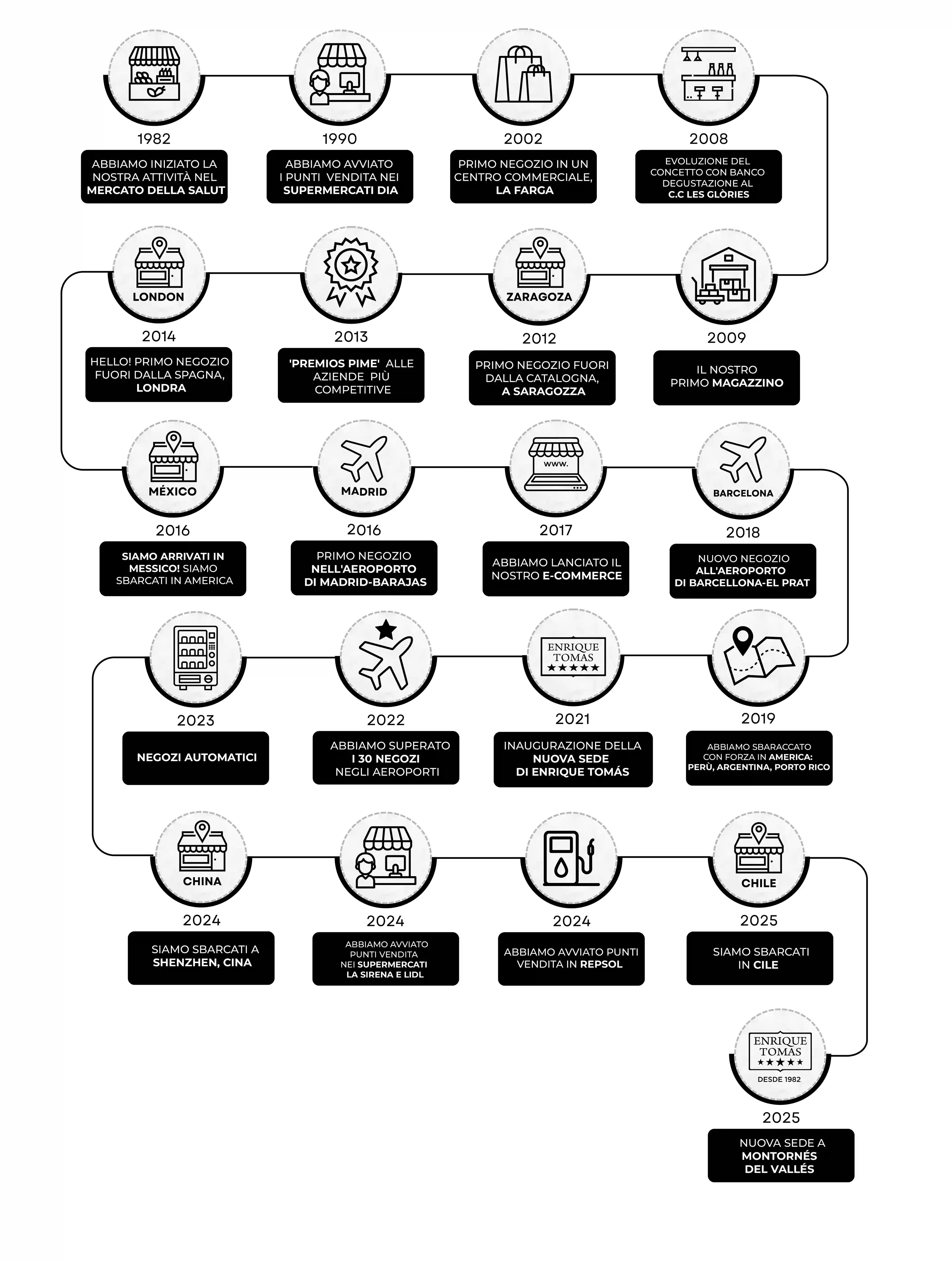 Grazie all'esperienza accumulata, a valori ben definiti (tradizione, qualità, lavoro, impegno e gratitudine) e a un grande intuito imprenditoriale, Enrique Tomás ha iniziato ad aprire i suoi propri esercizi nel 1987, espandendoli in tutta la provincia di Barcellona. Parallelamente, ha creato e progettato la struttura aziendale necessaria per garantire che la gestione dei diversi negozi fosse coerente, sostenibile e redditizia.