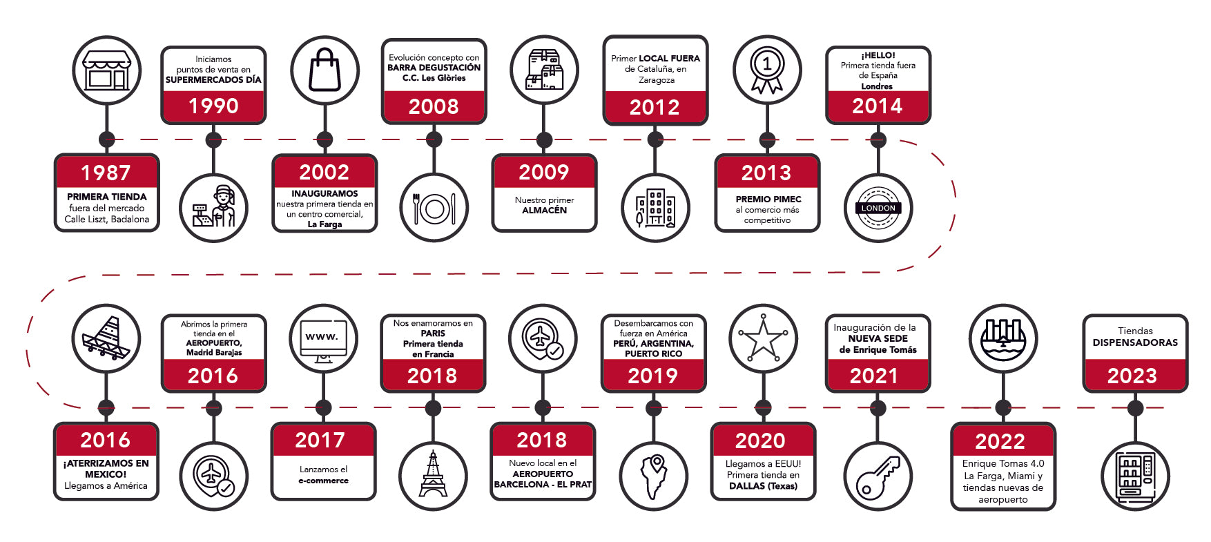 Aquí os dejamos un puñado de hitos históricos, que marcan el crecimiento del proyecto. Nos hubiera encantado que este listado estuviera lleno de nombres de personas, los que trabajamos en la marca y, sobre todo, los nombres de miles de clientes, de amigos. Pero eso es imposible. Sirva, pues, este listado de homenaje a todos los que son Enrique Tomás.