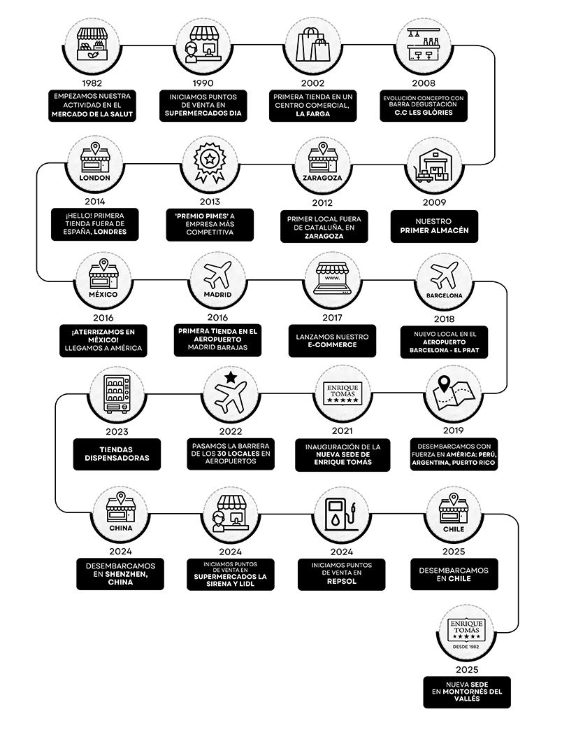 Gracias a la experiencia acumulada, unos valores bien definidos (tradición, calidad, trabajo, compromiso y agradecimiento) y una gran intuición empresarial, Enrique Tomás inició en 1987 la apertura de establecimientos propios que expandió por toda la provincia de Barcelona. Paralelamente, creó y diseñó la estructura corporativa necesaria para que la gestión de los diferentes comercios fuera uniforme, sostenible y rentable.
